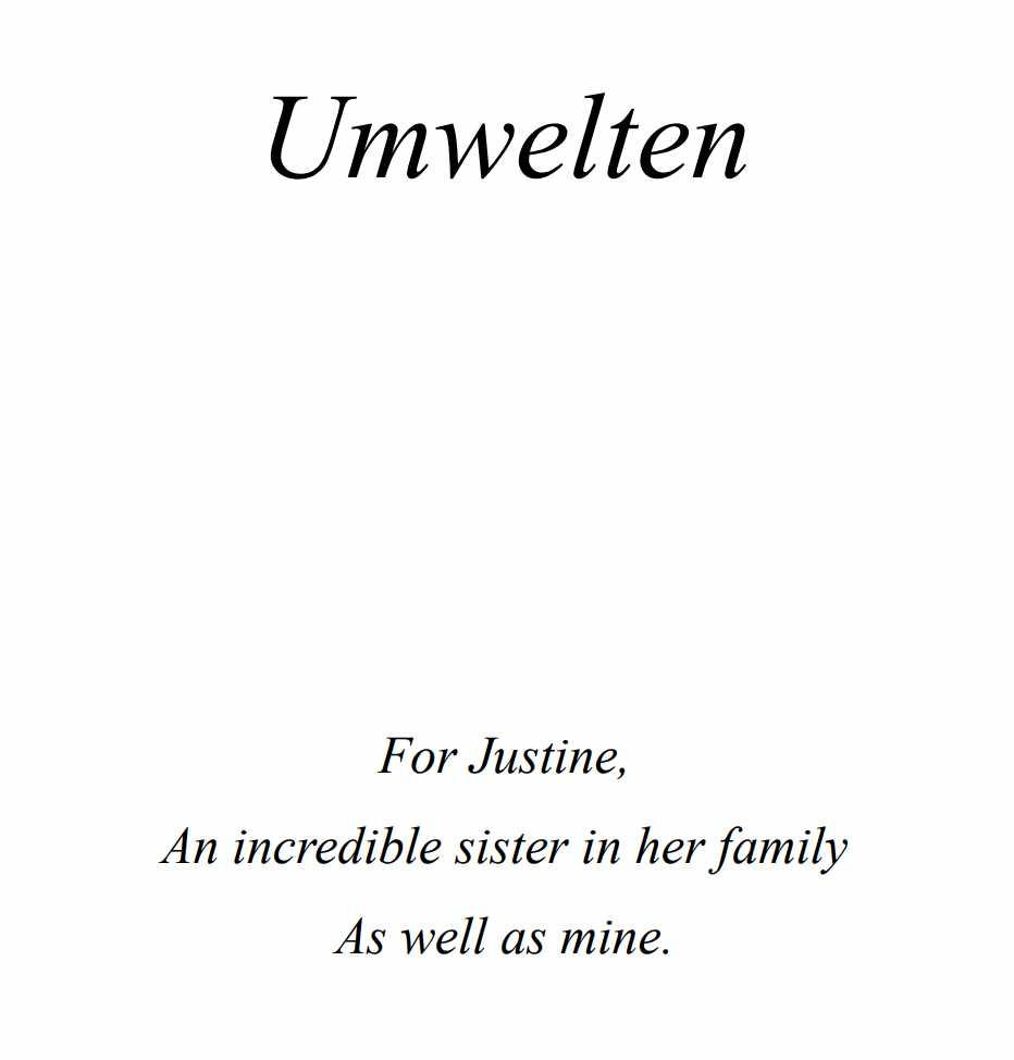 Umwelten, as I called it, is easily my favorite piece of my own writing. Although I have not worked on it since this July, it is still a draft, and I absolutely plan on coming back to it when I am more fully employed.